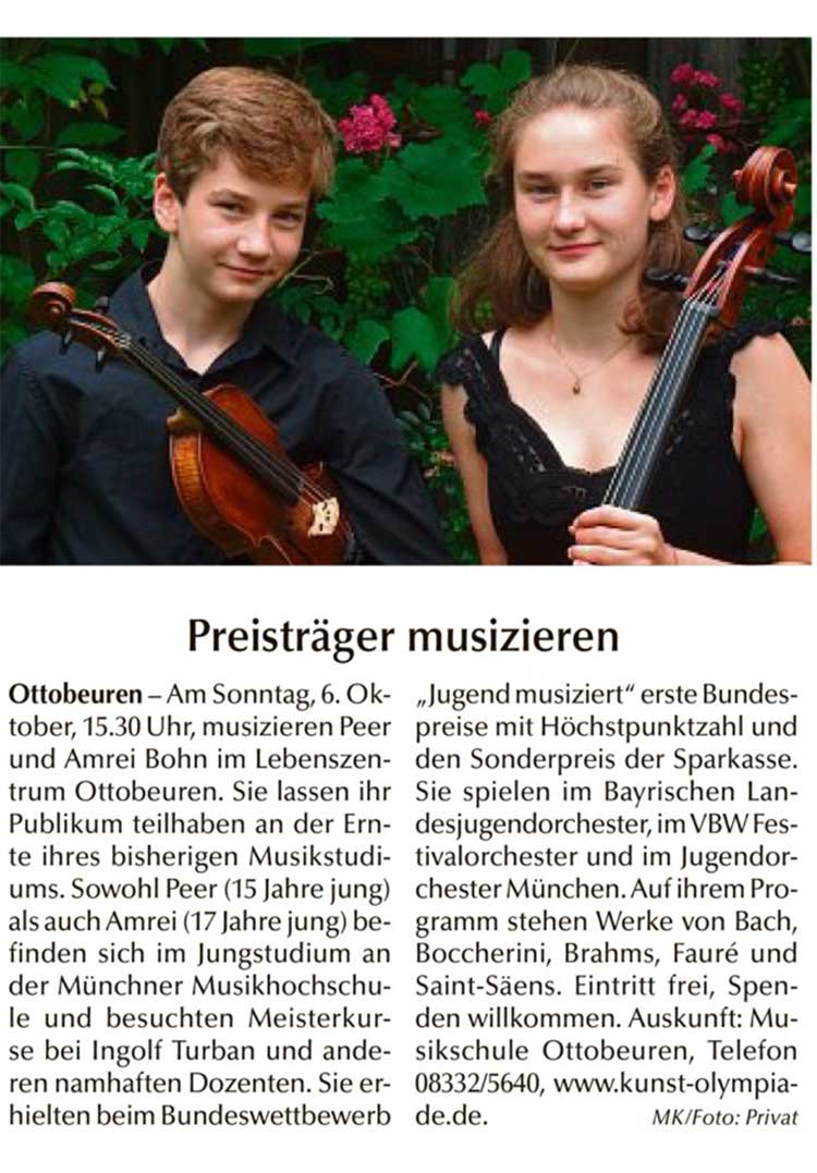 Auskunft: Musikschule Ottobeuren, Tel.: 08332-6464, www.kunst-olympiade